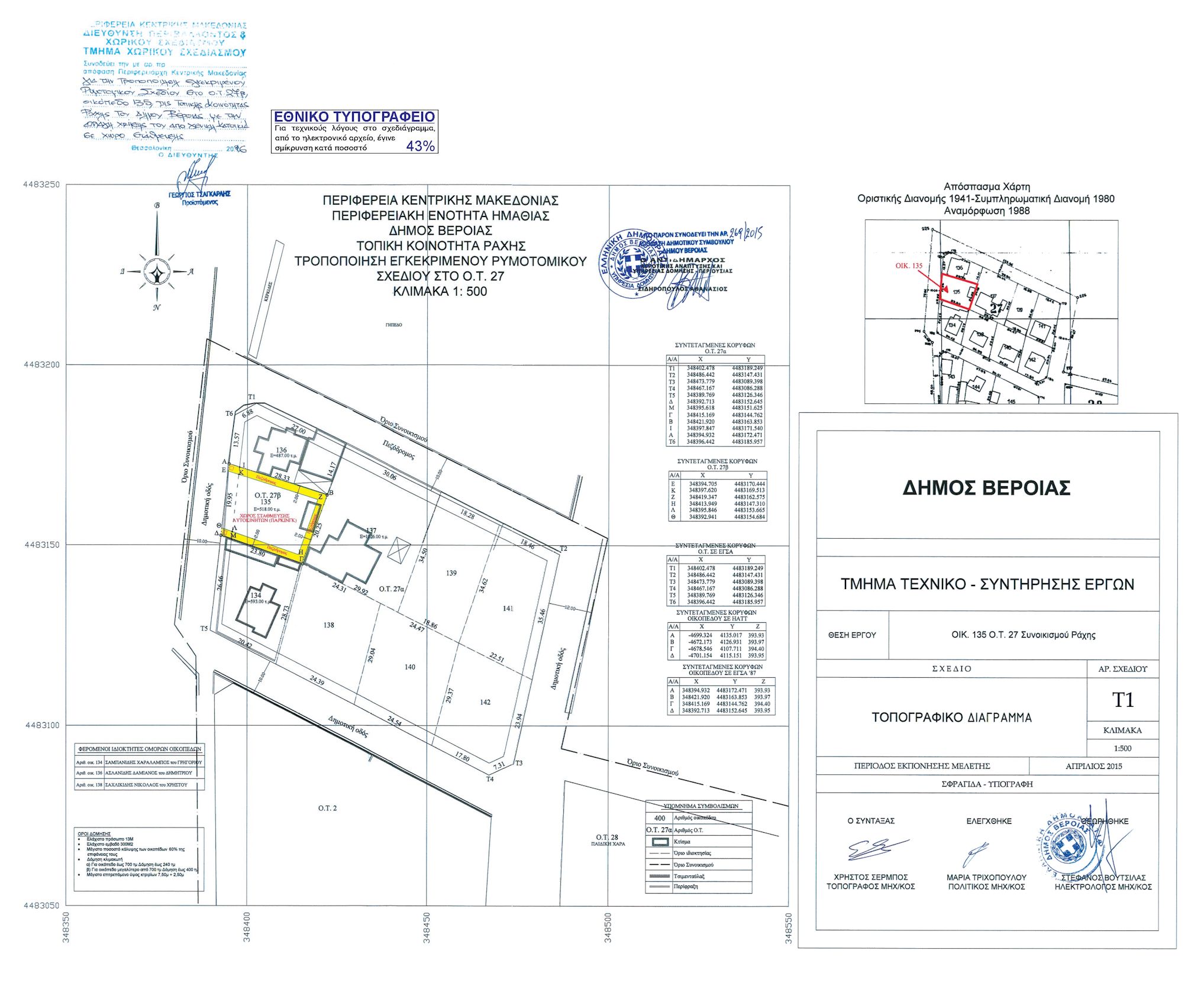 for(var i=0; i Την έγκριση της τροποποίησης του εγκεκριμένου ρυμοτομικού Σχεδίου στο οικοδομικό τετράγωνο 27Β, έκτασης 381,36 m2 (που αποτελεί μέρος του 135 οικόπεδου), της Τοπικής Κοινότητας Ράχης του Δήμου Βέροιας με: α) τον χαρακτηρισμό του οικοδομικού τετραγώνου 27Β, με τα στοιχεία Α,Ι,Β,Γ,Μ,Δ,Θ,Ε,Α, σε ΧΩΡΟ ΣΤΑΘΜΕΥΣΗΣ (parking) και β) την επιβολή περιμετρικού πεζοδρόμου πλάτους 2 m. γ) όρους δόμησης που ισχύουν στην περιοχή: όπως οι ρυθμίσεις αυτές παρουσιάζονται στο επισυναπτόμενο τοπογραφικό σχεδιάγραμμα σε κλίμακα 1:500 που συνοδεύει την εισήγηση αυτή. ";