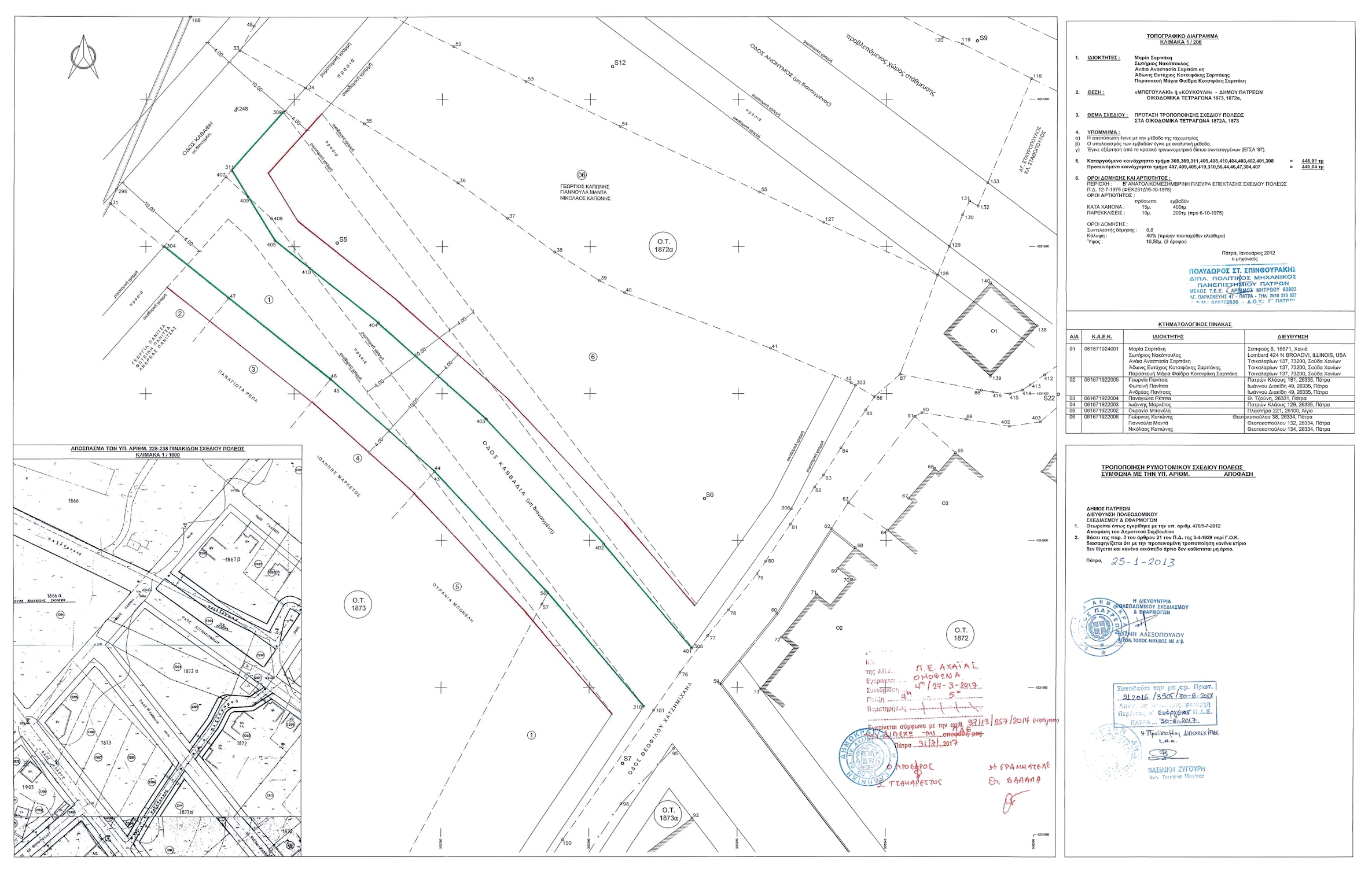 Απόφαση 212016/3905/2017: Έγκριση τροποποίησης ρυμοτομικού Σχεδίου Πόλεως Πατρών, δια αναδιατάξεως της ρυμοτομίας στα οικοδομικά τετράγωνα 1872Α και 1873 στην περιοχή Μπεγουλάκι ή Κουκούλι του Δήμου Πατρέων, (ΦΕΚ 220/ΑΑΠ/2017), 27-09-2017.