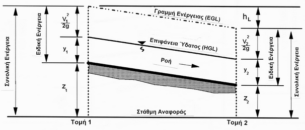 Η εξίσωση της ενέργειας χρησιμοποιείται για τον υπολογισμό της αλλαγής της στάθμης της επιφάνειας του νερού μεταξύ δυο σχετικώς όμοιων διατομών. Μια απλοποιημένη μορφή της εξίσωσης είναι: