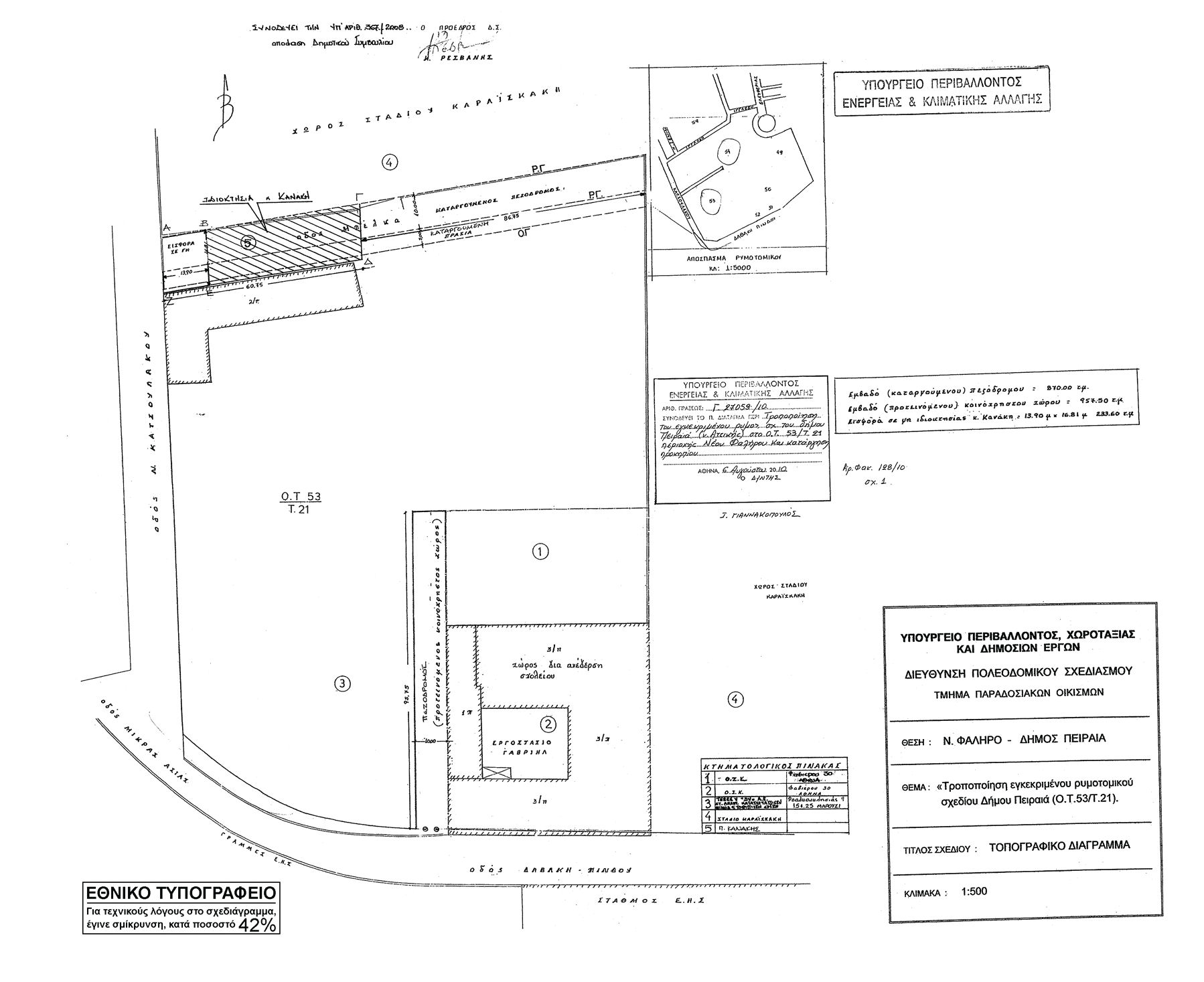 for(var i=0; i Εγκρίνεται η τροποποίηση του εγκεκριμένου ρυμοτομικού σχεδίου του δήμου Πειραιά στο Ιστορικό Κέντρο της πόλης που έχει χαρακτηριστεί παραδοσιακό με το από 27-07-1982 προεδρικό διάταγμα (ΦΕΚ 410/Δ/1982) και ειδικότερα στο Οικοδομικό Τετράγωνο 53/Τ.21 περιοχής Νέου Φαλήρου, με την κατάργηση της αδιάνοιχτης οδού Μπέλκα, και την έγκριση πεζοδρόμου, όπως φαίνεται στο σχετικό πρωτότυπο διάγραμμα σε κλίμακα 1:500 που θεωρήθηκε από τον Προϊστάμενο της Διεύθυνσης Τοπογραφικών Εφαρμογών με την 27059/2010 πράξη του και που αντίτυπο του σε φωτοσμίκρυνση δημοσιεύεται με το παρόν διάταγμα. ";