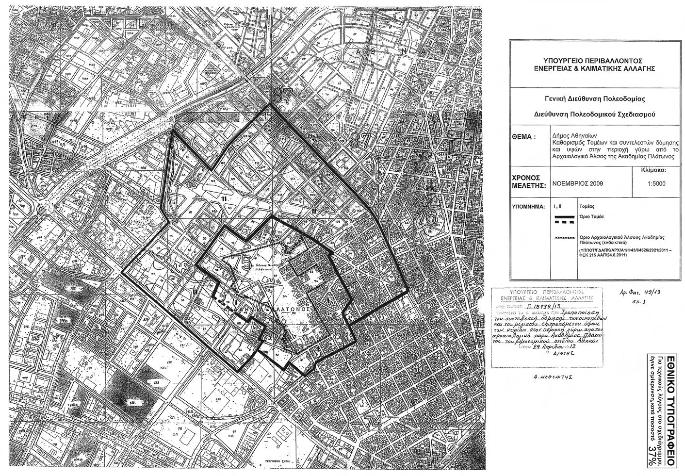 Τροποποιούνται ο συντελεστής δόμησης των οικοπέδων και το μέγιστο επιτρεπόμενο ύψος των κτιρίων στην περιοχή γύρω από τον Αρχαιολογικό χώρο Ακαδημίας Πλάτωνος του ρυμοτομικού σχεδίου Αθηνών και καθορίζονται κατά τομείς Ι, II και III, τα όρια των οποίων φαίνονται με συνεχή και διακεκομμένη μαύρη γραμμή στο σχετικό πρωτότυπο διάγραμμα σε κλίμακα 1:5000 που θεωρήθηκε από τον Προϊστάμενο της Διεύθυνσης Τοπογραφικών Εφαρμογών με την υπ' αριθμόν 18728/2013 πράξη του και που αντίτυπο του σε φωτοσμίκρυνση δημοσιεύεται με το παρόν διάταγμα και καθορίζονται όπως στις επόμενες παραγράφους: